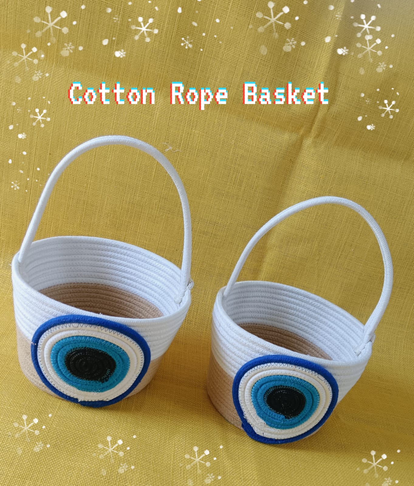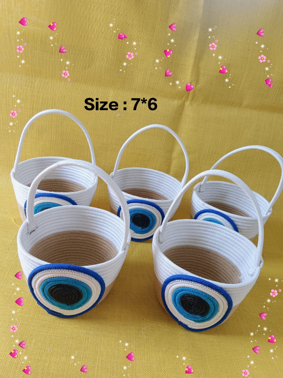 This cotton rope basket is designed to be both useful and stylish. Made with sturdy rope, it comes with a strong handle for easy carrying. The highlight is the striking evil eye motif in the front, which adds a decorative and meaningful touch.