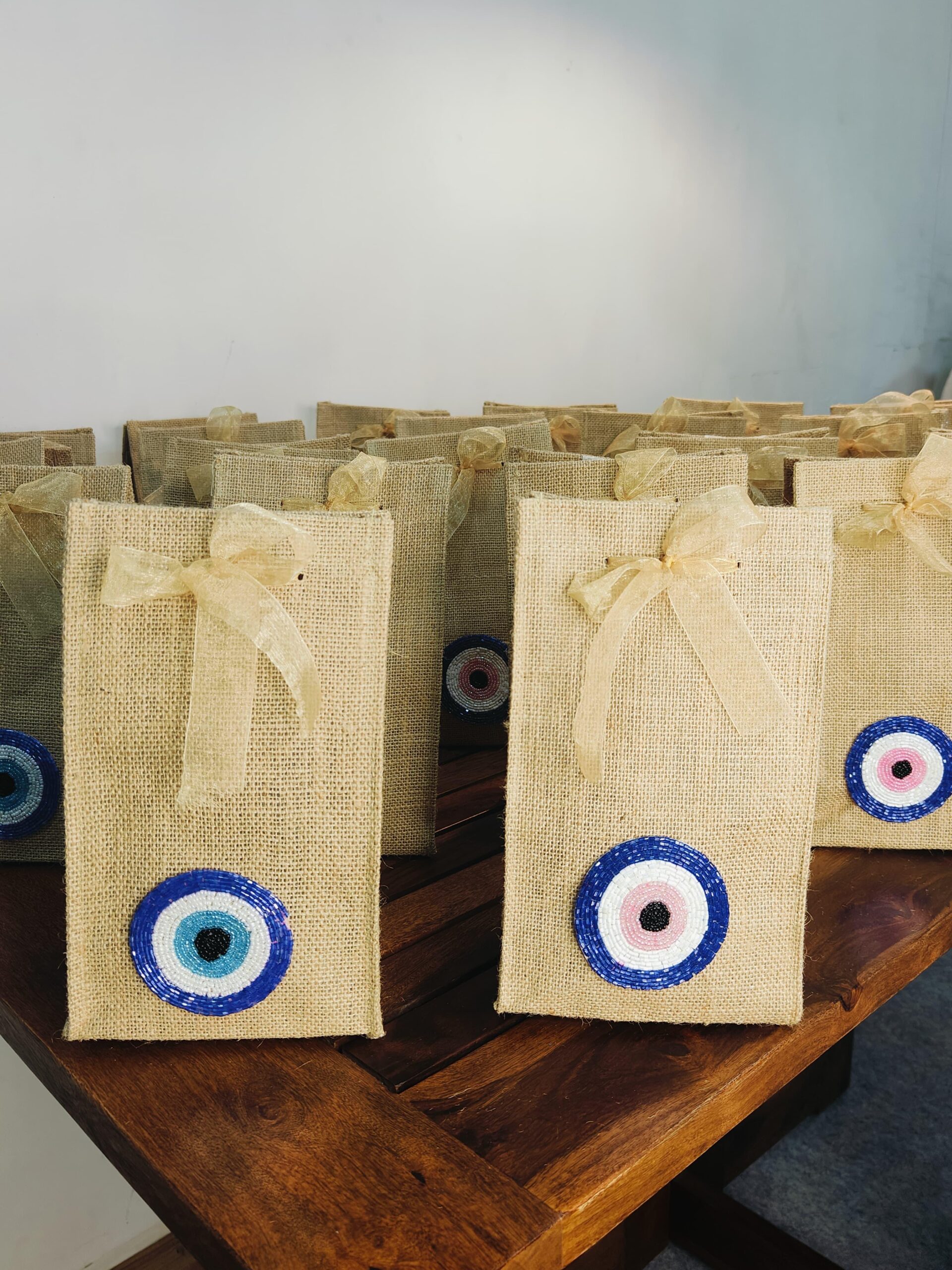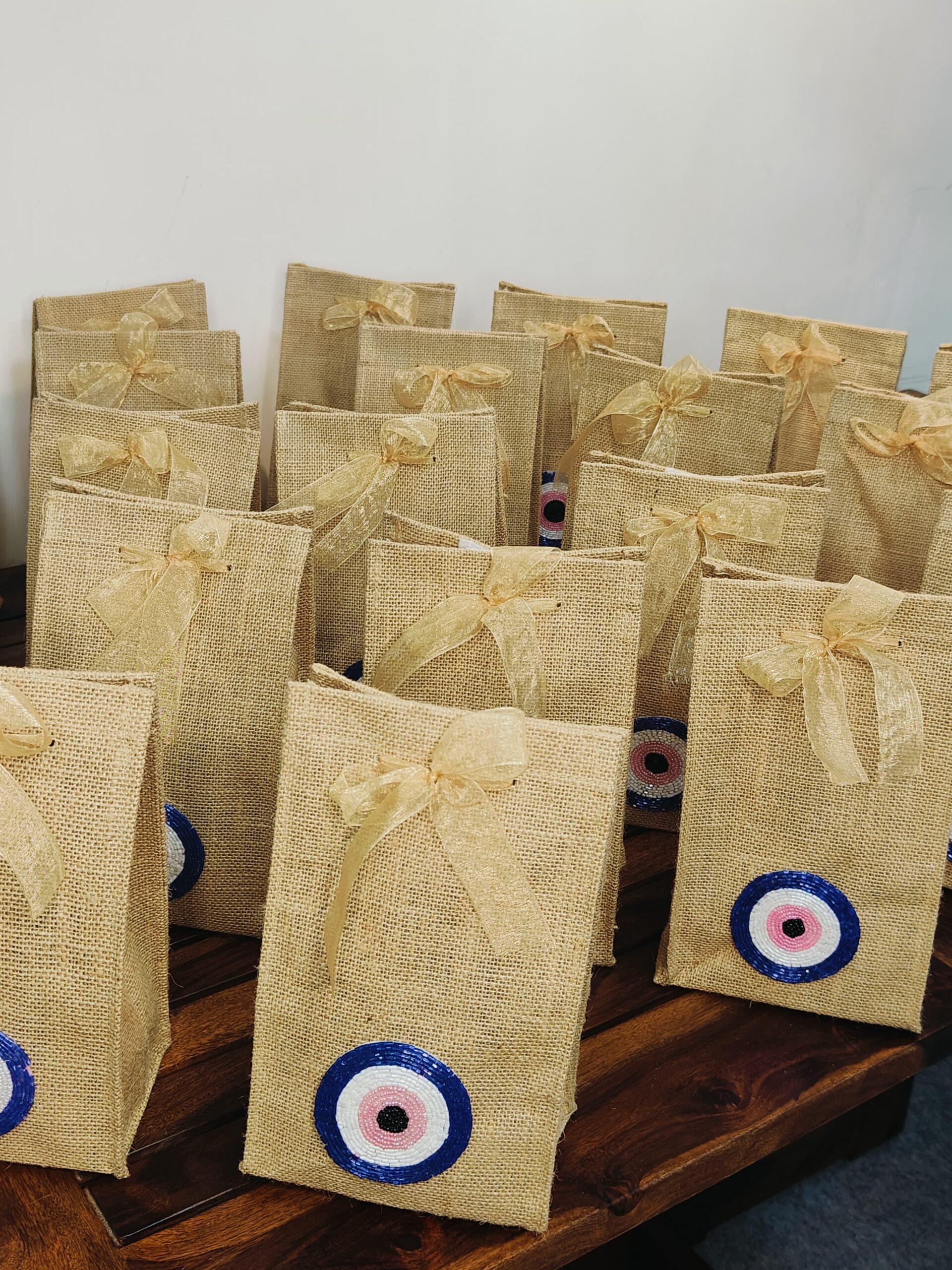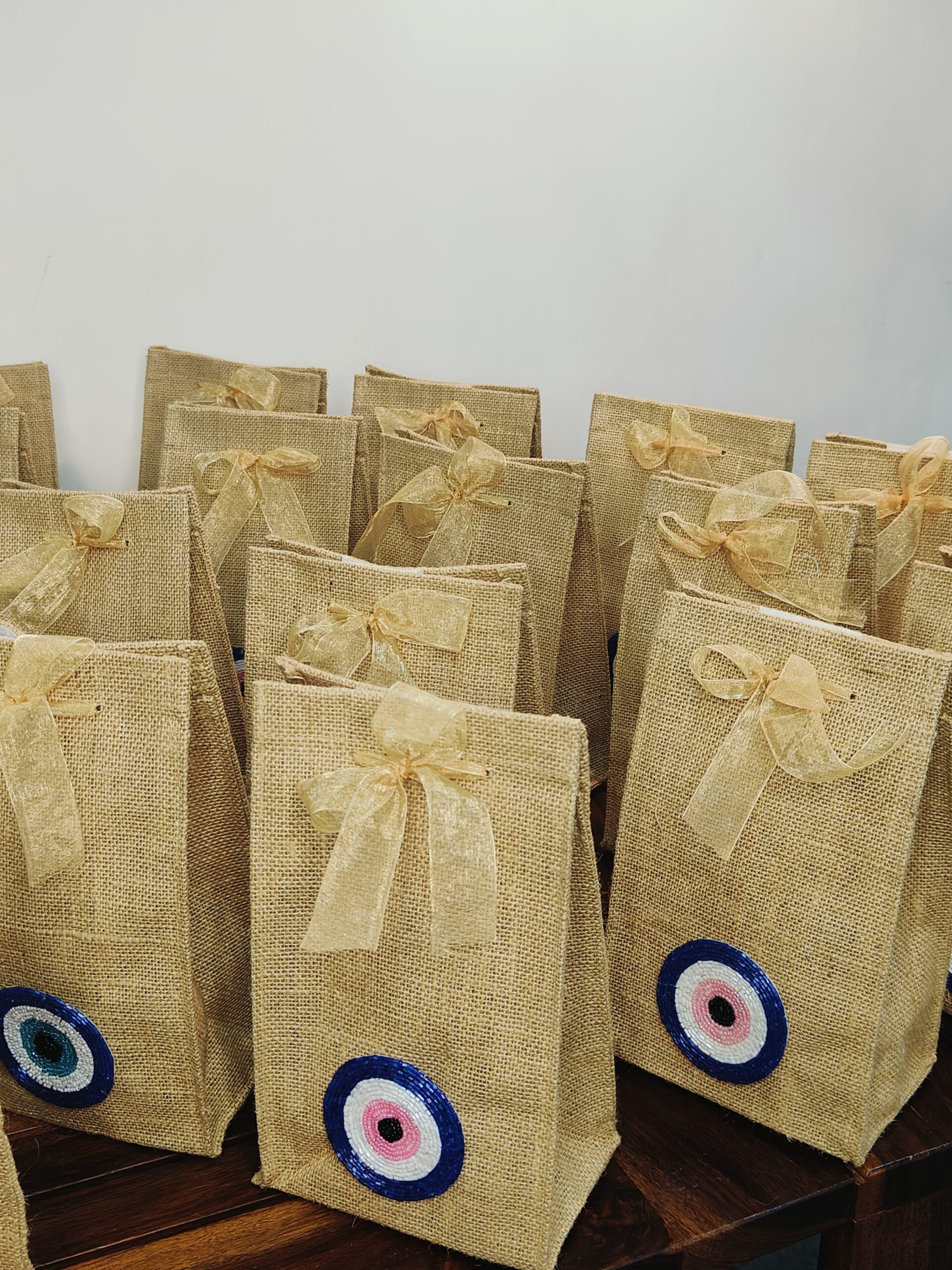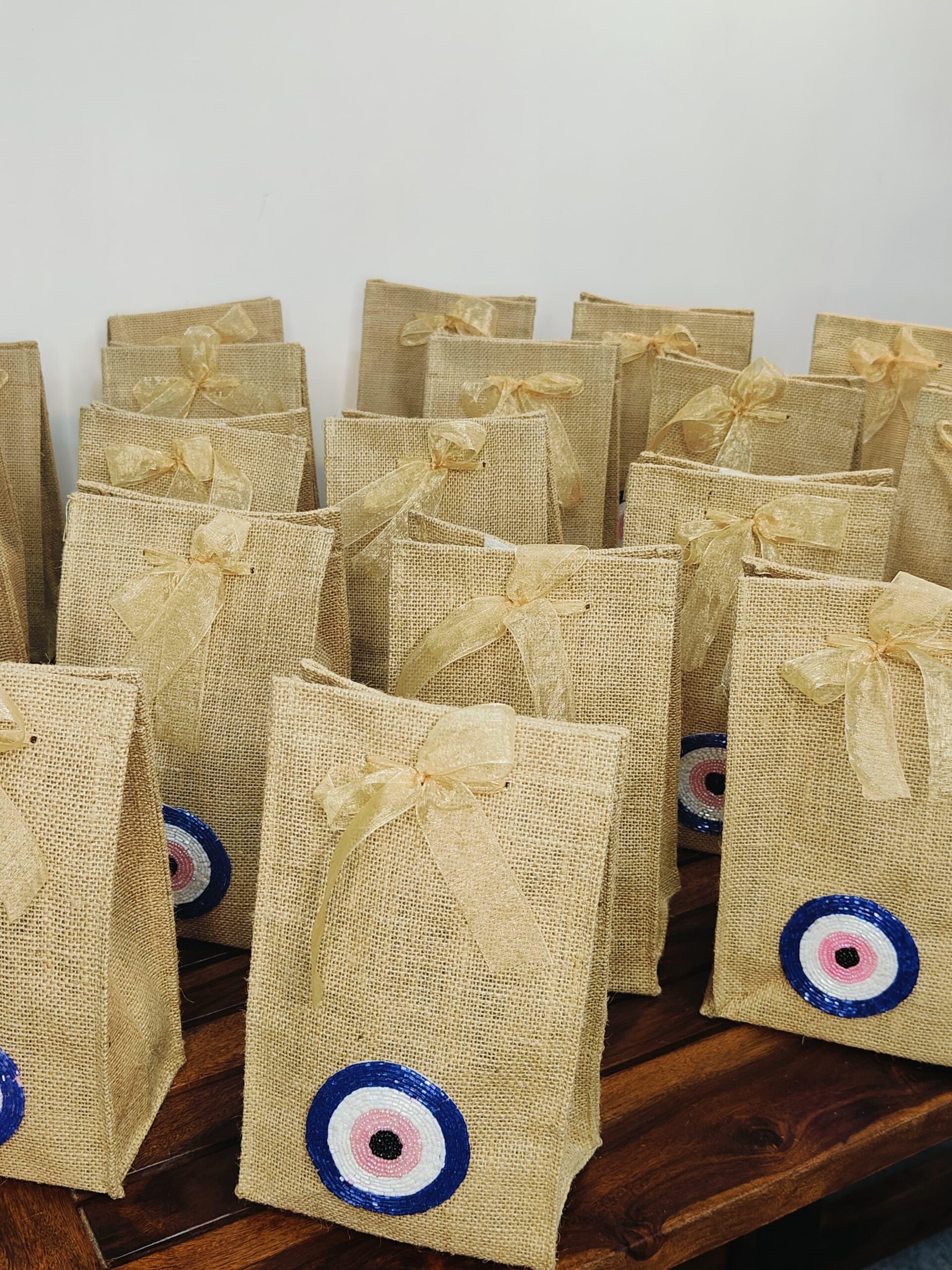Bring a touch of elegance and symbolism to your gifts with these finely crafted jute bags, adorned with a graceful evil eye motif and it has velcro closure on top.Made from eco-friendly natural jute, these bags are strong, reusable, and perfect for thoughtful packaging. The evil eye detail adds a unique touch, symbolizing protection and positivity, making them suitable for weddings, festive celebrations, return favors, or corporate giveaways. Finished with a delicate bow tie, these bags bring together sustainability, style, and tradition in one thoughtful package.