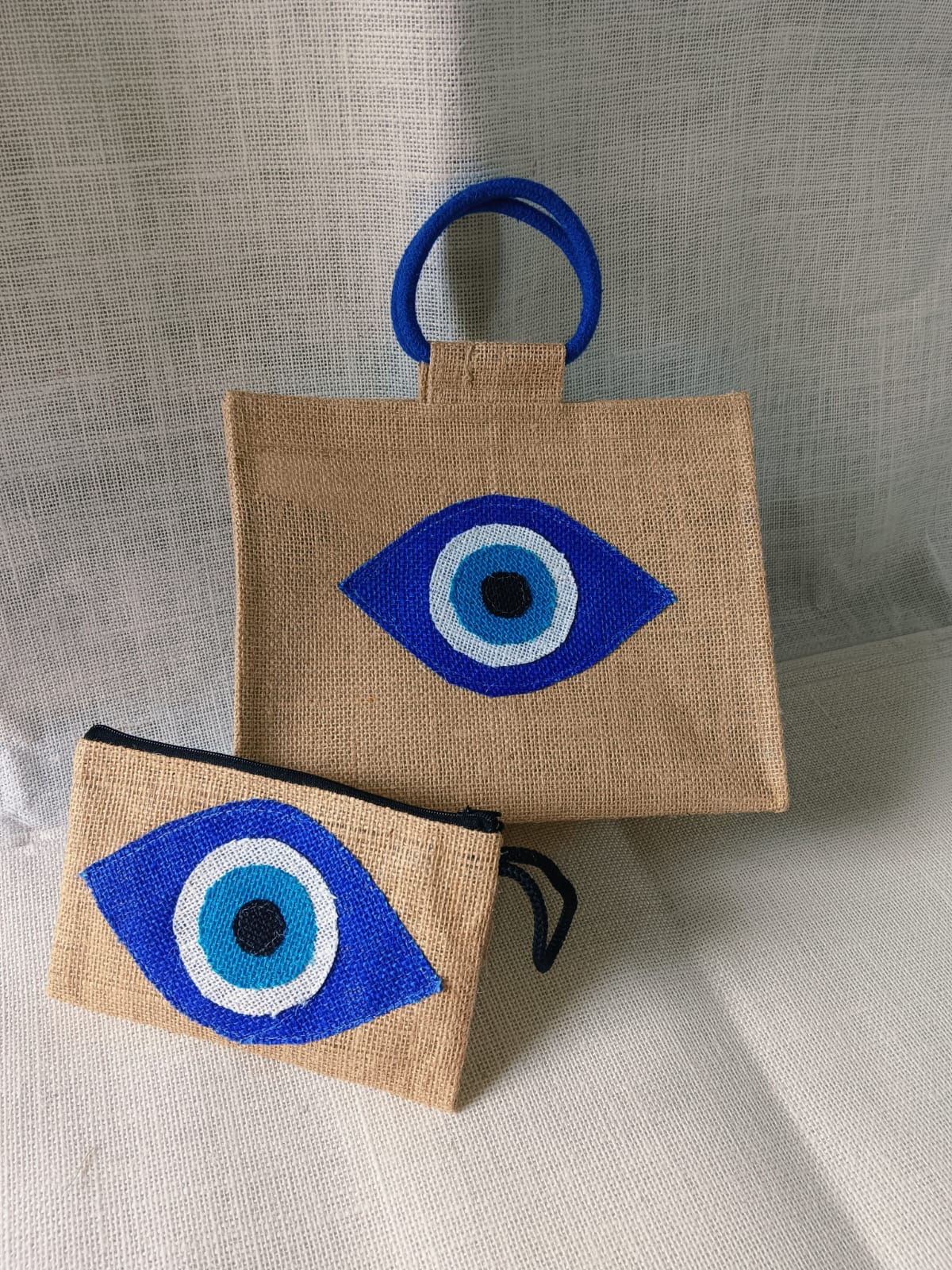 Evil Eye Jute Bags bring together sustainability, durability, and cultural charm. Made from strong natural jute, these eco-friendly bags stand out with the symbolic evil eye motif, believed to offer protection and positive energy. Designed with sturdy handles and a spacious interior, they are practical for shopping, everyday use, or gifting. Their rustic texture and meaningful design make them suitable for festive occasions, return gifts, or corporate promotions. Each bag can also be customized with prints, logos, or event details, making them a thoughtful choice for both personal use and bulk orders. Combining style with functionality, Evil Eye Jute Bags are more than just carry bags—they are a symbol of good fortune and conscious living.