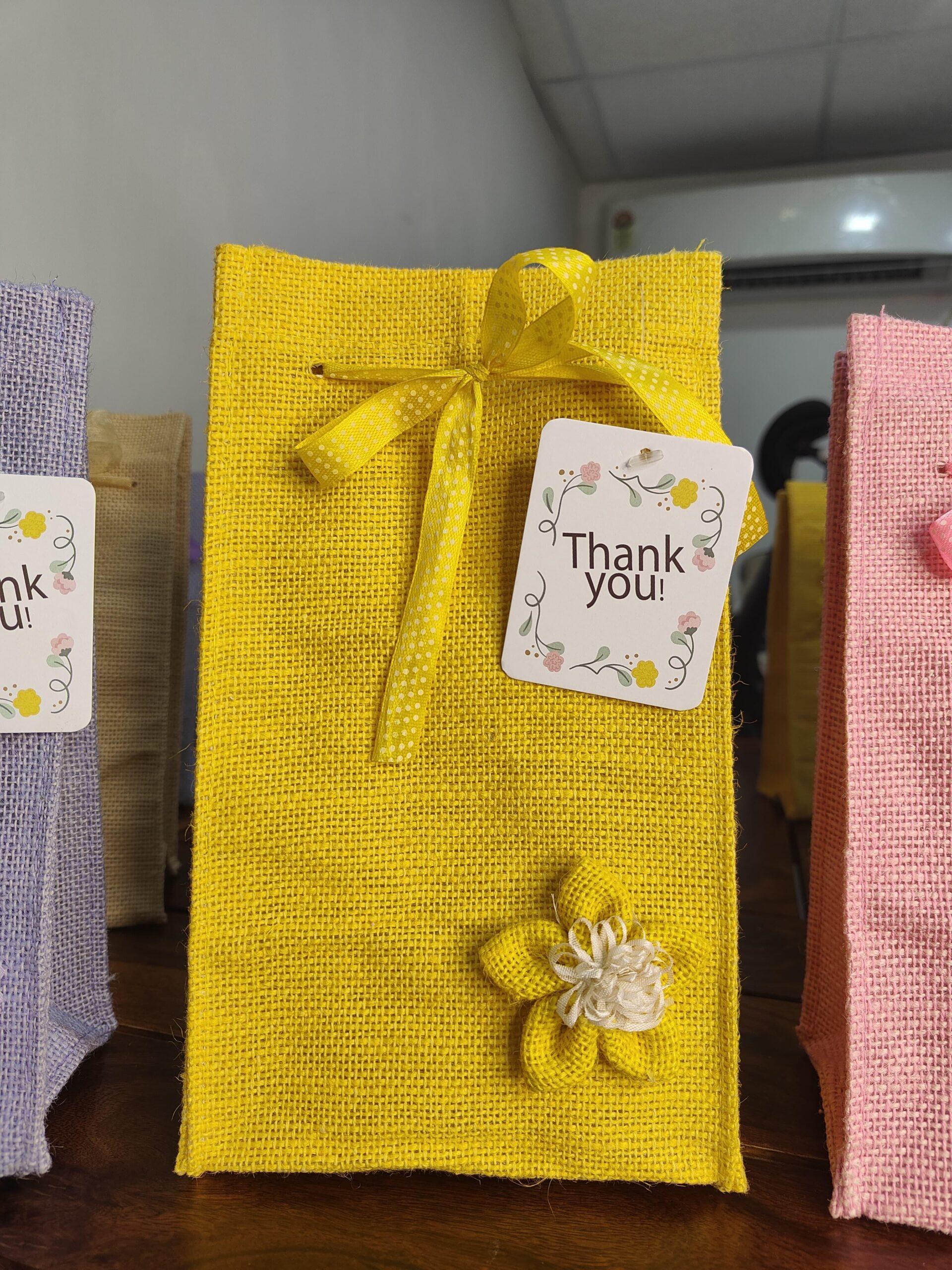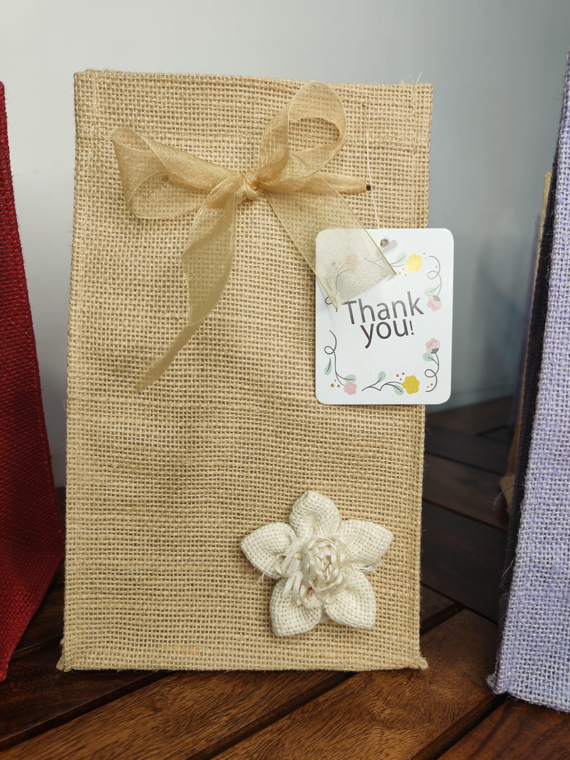 Add a touch of elegance to your gifting with this handcrafted jute return bag. A soft bow paired with a floral accent makes this bag a charming mix of beauty and simplicity.